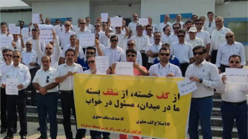 شورای سازماندهی اعتراضات کارگران پیمانی نفت گزارش داد که روز دوشنبه کارکنان رسمی در صنعت نفت در اعتراض به «سقف و کف حقوق و برای پیگیری مطالبات بر زمین مانده خود»، در مناطق مختلف ایران تجمع کردند.