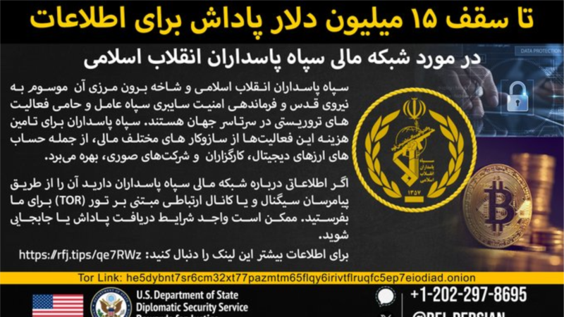 برنامه «پاداش برای عدالت» وزارت امور خارجه آمریکا، جایزهای تا سقف ۱۵ میلیون دلار برای دریافت اطلاعات درباره شبکه مالی سپاه پاسداران انقلاب اسلامی و بازوی برونمرزی آن، نیروی قدس، تعیین کرده است. هدف این برنامه، مختل کردن سازوکارهای تأمین مالی سپاه و اعمال فشار بیشتر بر این نهاد که در فهرست سازمانهای تروریستی خارجی آمریکا قرار دارد، عنوان شده است.