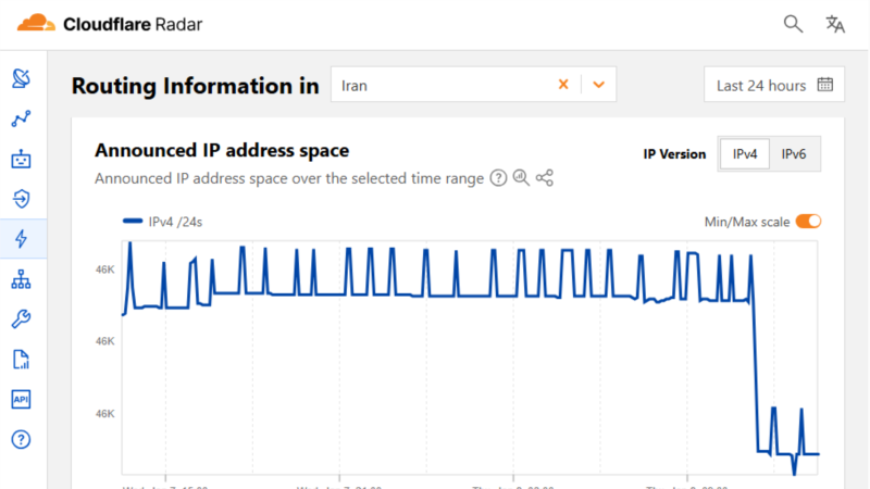 در پی شدت گرفتن اعتراضات سراسری در ایران، داده‌های شرکت زیرساختی کلودفلر نشان می‌دهد که درست پیش از ساعت ۱۲:۰۰ به‌وقت استاندارد جهانی (۳ و نیم بعدازظهر به وقت ایران)، میزان فضای آدرس‌دهی اعلام‌شده آی‌پی وی ۴ در ایران نزدیک به ۹۸.۵ درصد کاهش یافته است. هم‌زمان سهم ترافیک آی‌پی وی ۶ از حدود ۱۲ درصد به کمتر از دو درصد سقوط کرده است؛ نشانه‌ای روشن از دخالت هدفمند در جریان اینترنت بین‌المللی کشور.