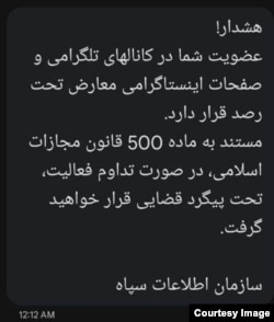 اطلاعات سپاه با ارسال این پیامک، شهروندان را تهدید کرده که «در صورت تداوم فعالیت، تحت پیگرد قضایی» قرار خواهند گرفت.